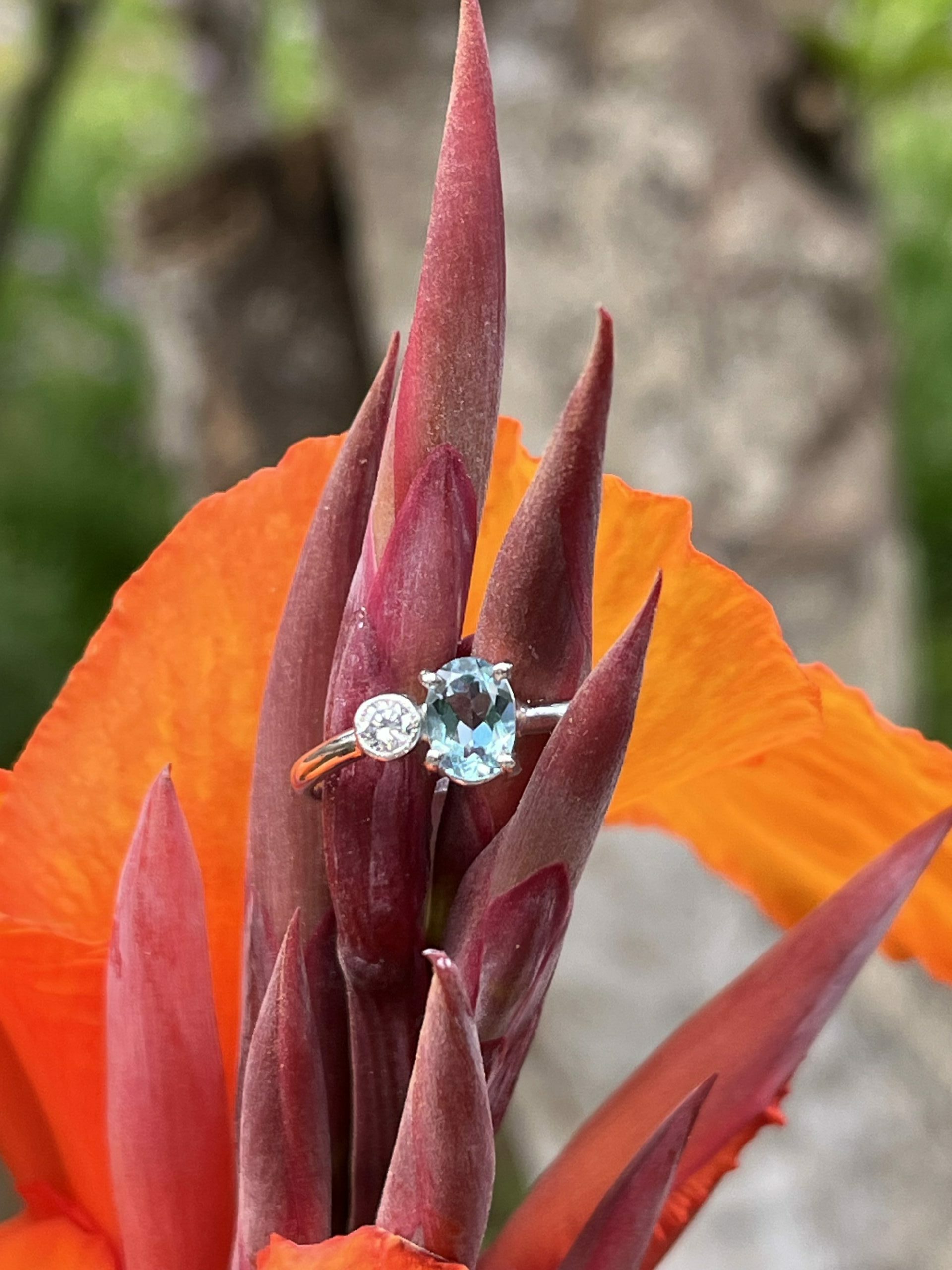 Une pierre d’aigue-marine éclatante accompagnée d’un diamant délicat, montés sur or.