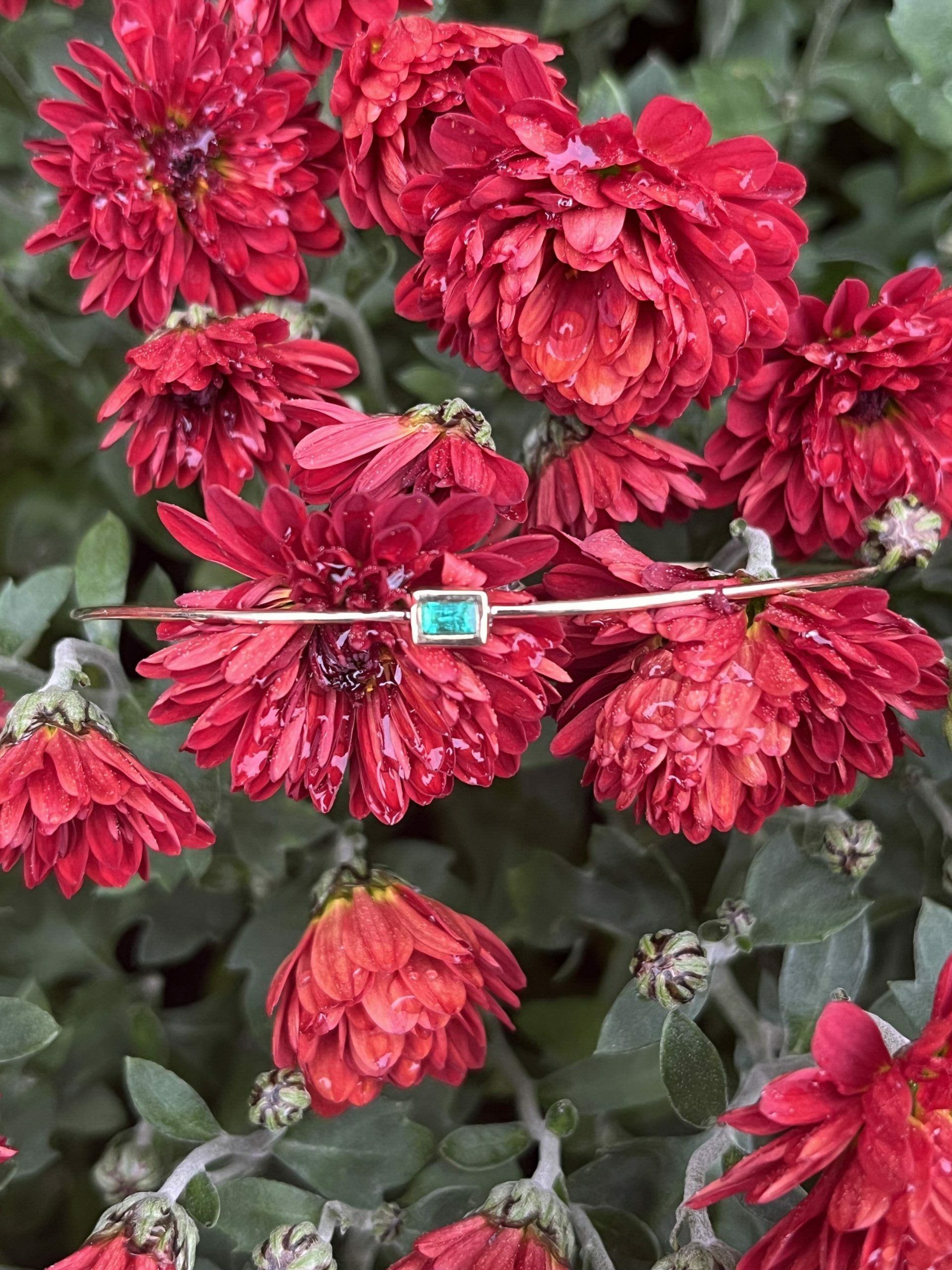 Bracelet fin orné d’une émeraude centrale, entre élégance brute et éclat végétal.