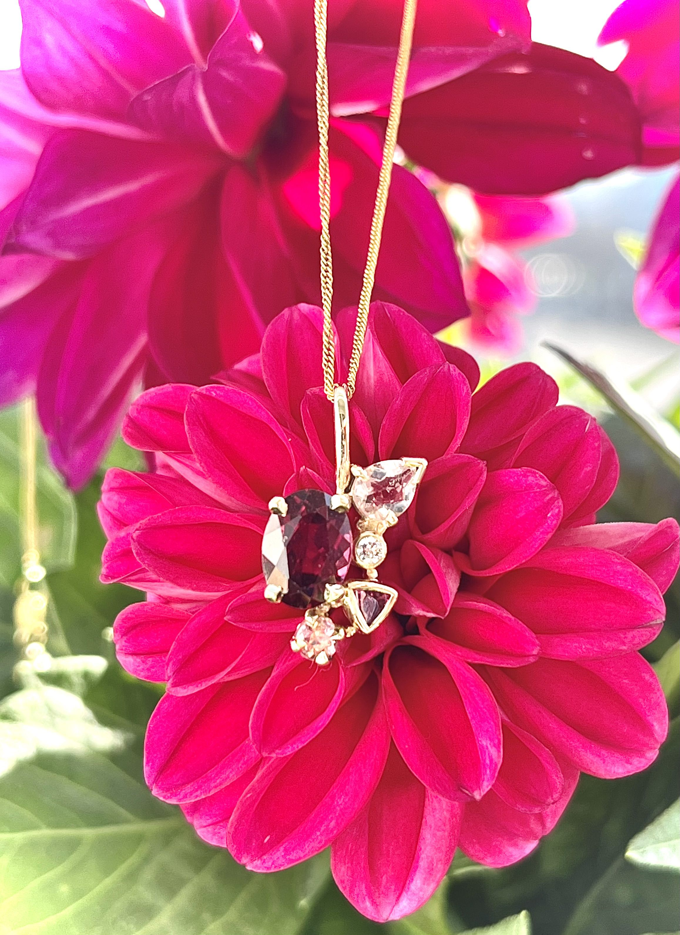 Alliance d’un grenat velouté, de pierres rose pâle et de diamants, sur une monture fine en or 18k..